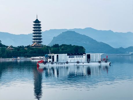 公司研發(fā)的加壓控藻船,以玻璃鋼船體為平臺,配置藍藻打撈、壓力控藻和曝氣裝置...